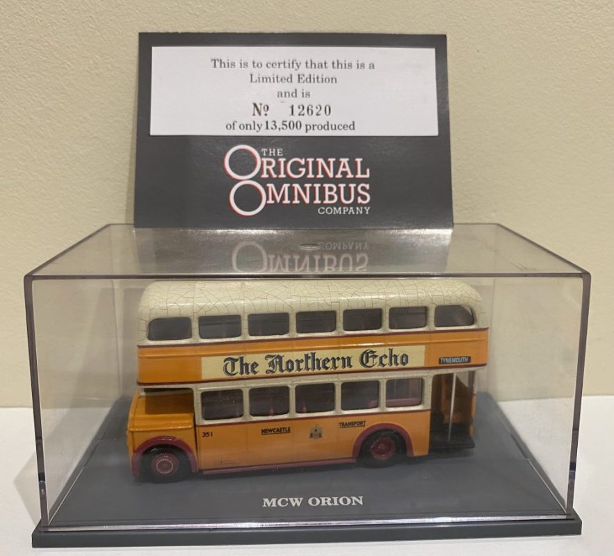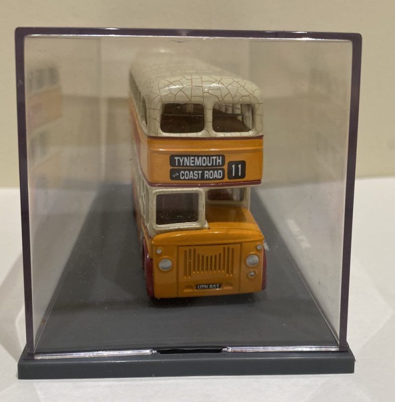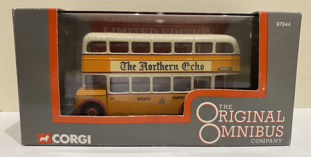 Corgi 97944 Leyland PD2 in Newcastle Corporation livery. UTN851 Destination 11 to Tynemouth. Roof has crazing to the paint which is common. Comes with original box and certificate. Outer card sleeve has some scuffs from storage.