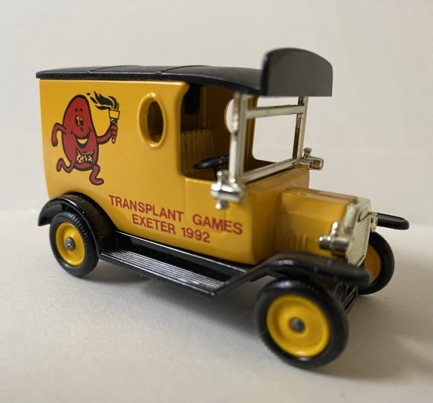 Lledo days gone Model T Ford van in the livery with decals of Transplant games, Exeter 1992.